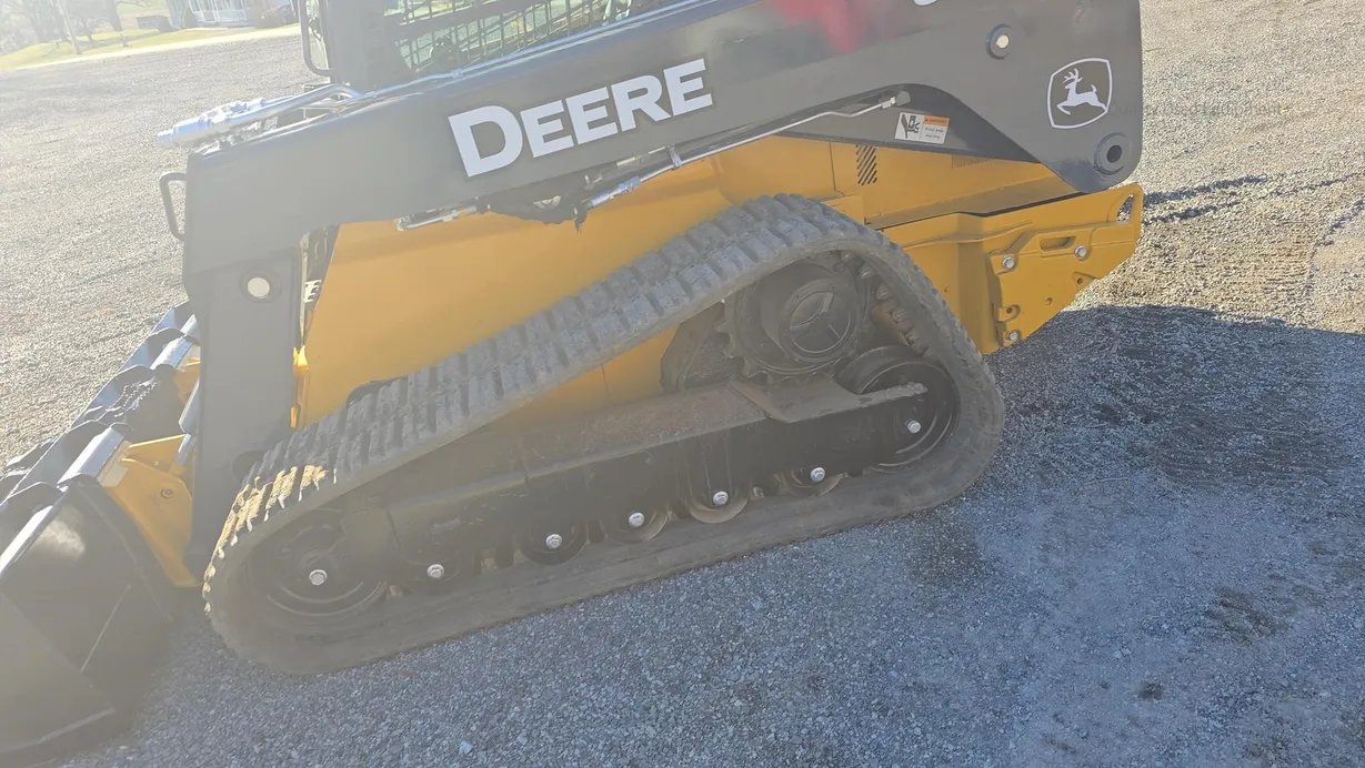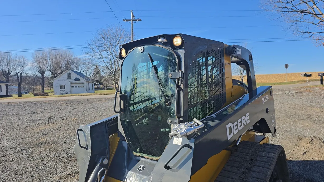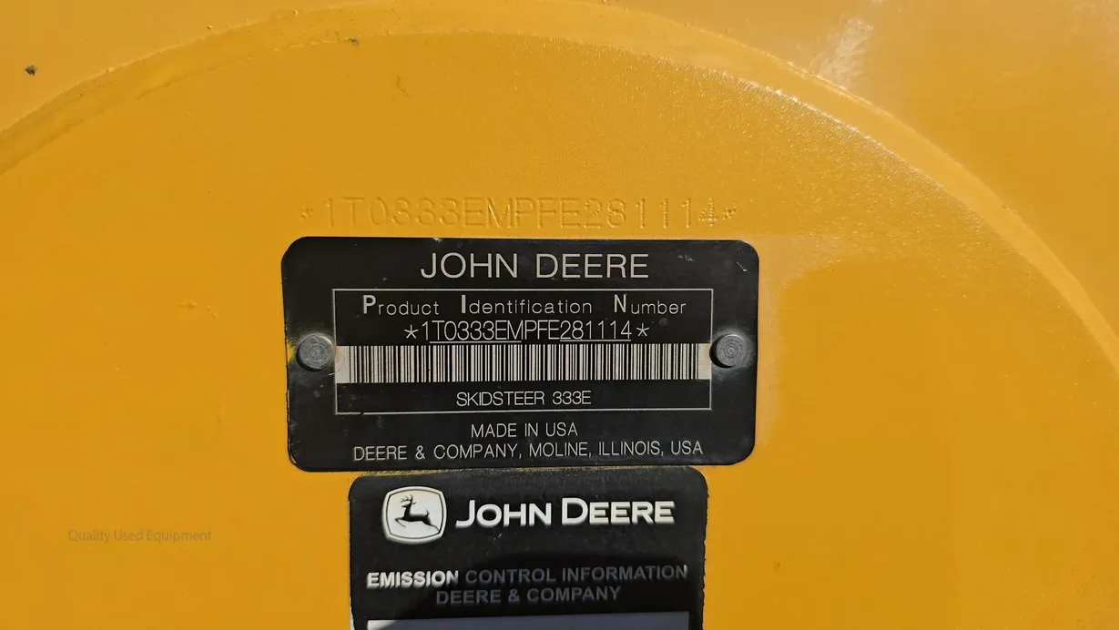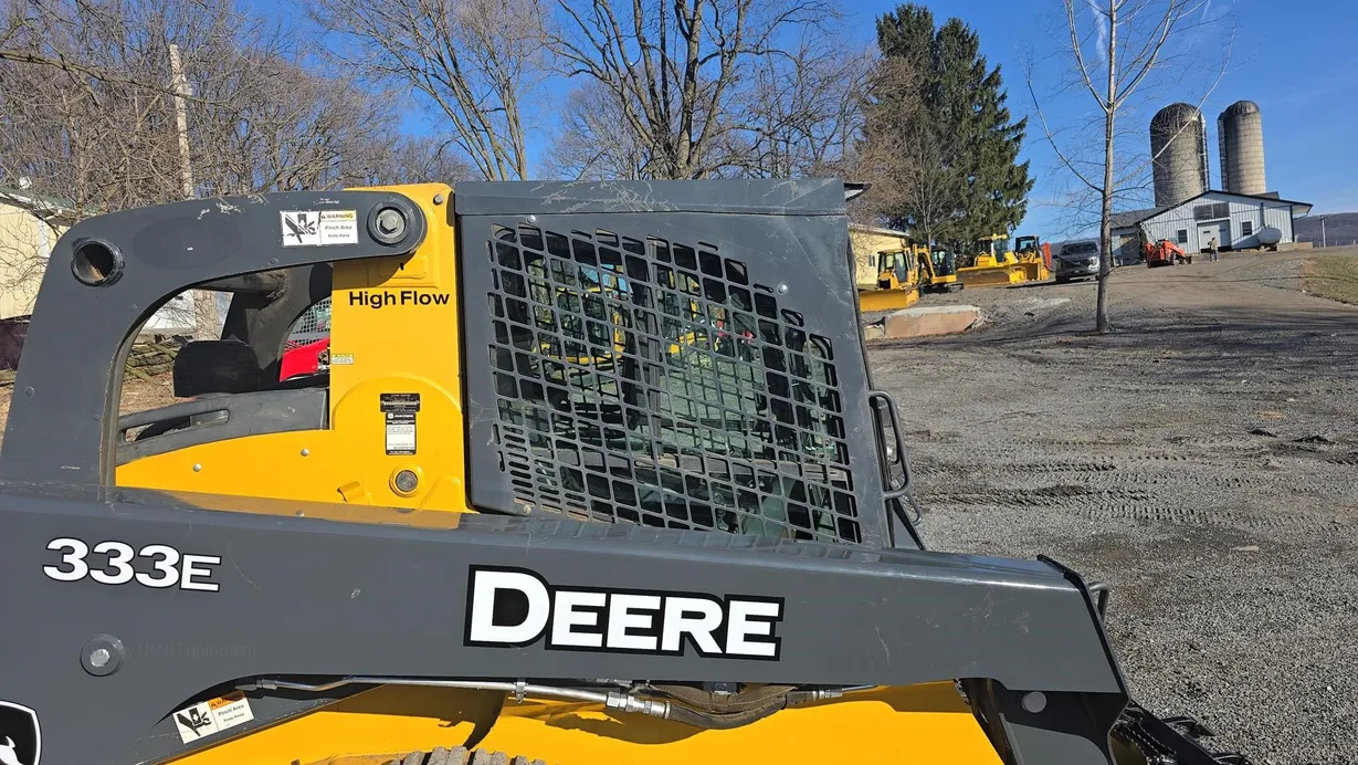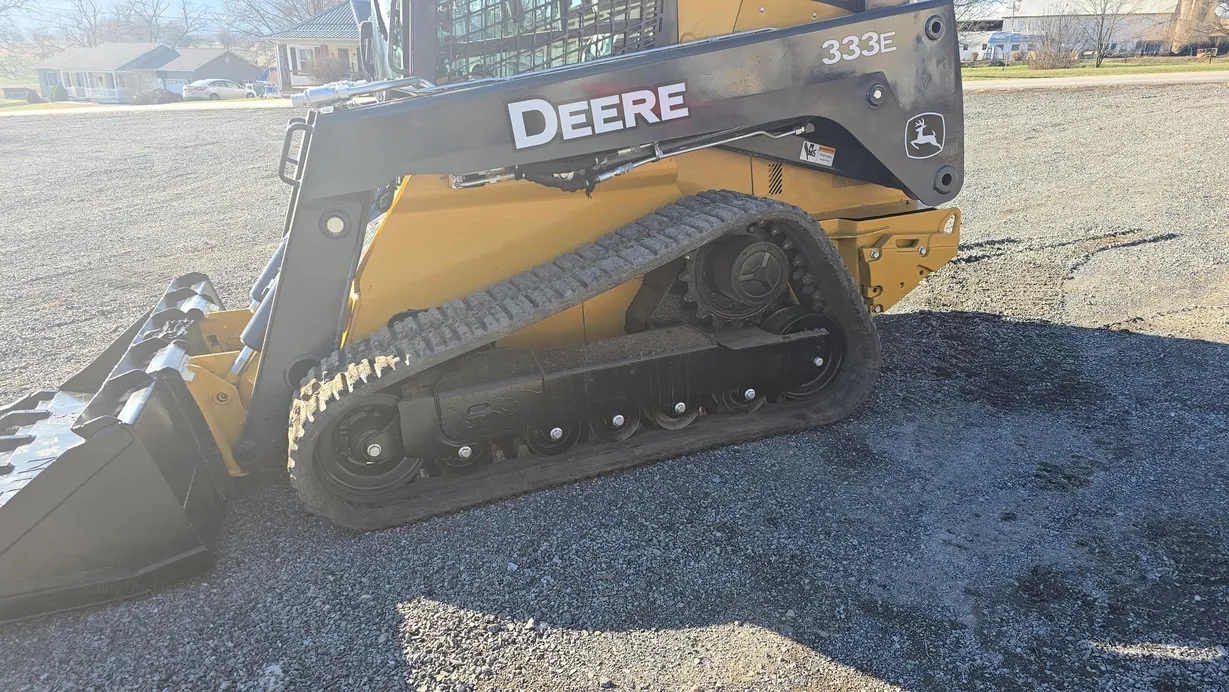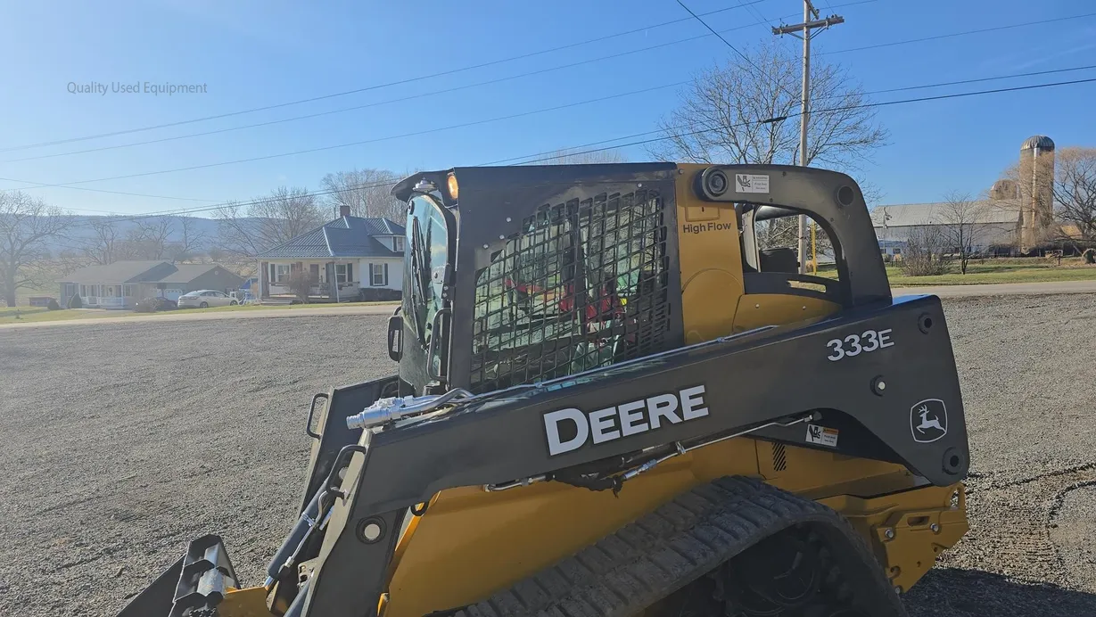 This 2015 Deere 333E compact track loader has 3,480 hours and is a well-maintained, job-ready machine ideal for construction, landscaping, and agricultural work. It features an enclosed ROPS cab with heat and air conditioning (HVAC system noted as not engaging), a comfortable cloth seat, and joystick controls for precise operation. The 333E comes equipped with high-flow auxiliary hydraulics and a manual coupler for added implement versatility. Power is supplied by a turbocharged Yanmar 4TNV94CHT diesel engine rated at 97 horsepower, providing strong performance for digging, grading, loading, and material handling tasks. This unit also features a vertical-lift boom design, two-speed travel capability (max 5.3 mph), and a breakout force of 6,600 lb, ensuring efficiency and productivity in demanding applications. Included with the machine is a general-purpose bucket, and the rubber tracks are in good condition with 70% remaining, while the undercarriage shows about 60% remaining life. The 333E has an operating capacity of 3,300 lb and tipping load of 9,425 lb, with an operating weight of 11,800 lb. Additional features include halogen lights, rearview camera, counterweight, and fully functional gauges. Overall, this 333E runs and operates very well, making it a reliable and versatile loader for multiple applications.