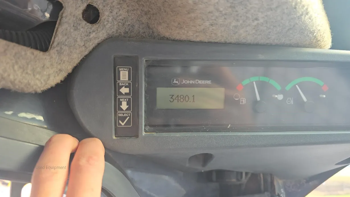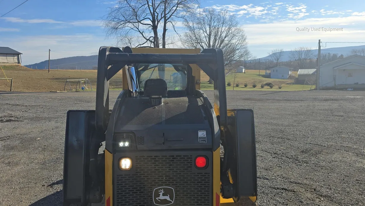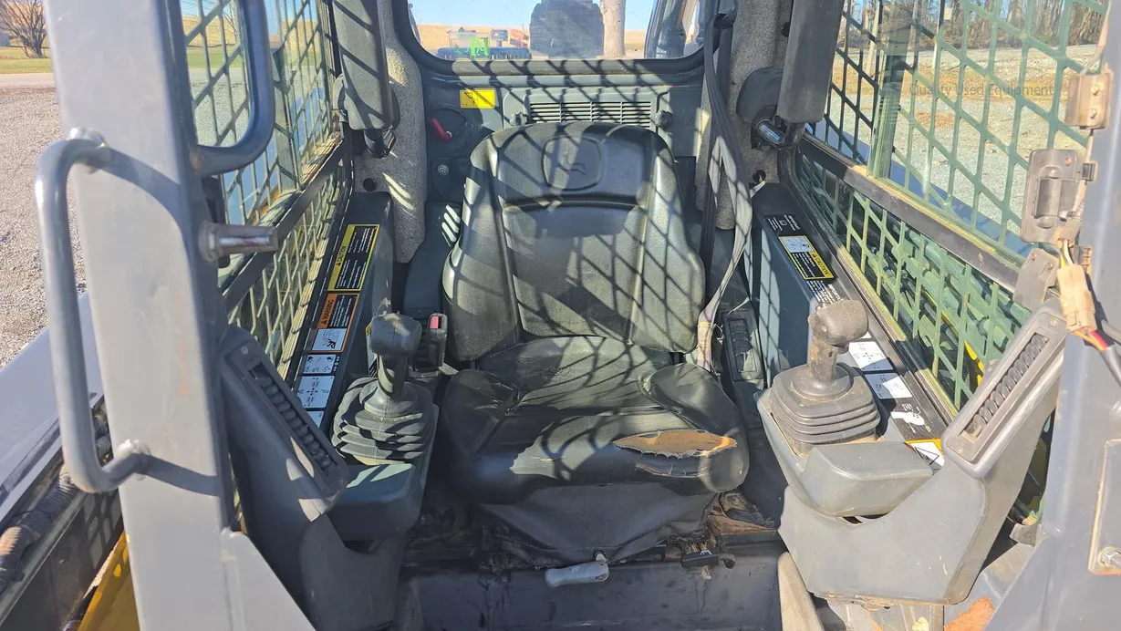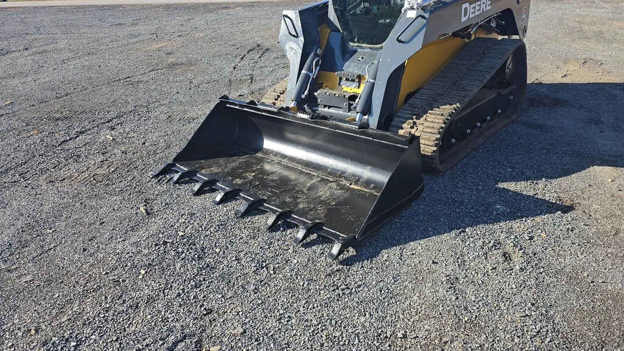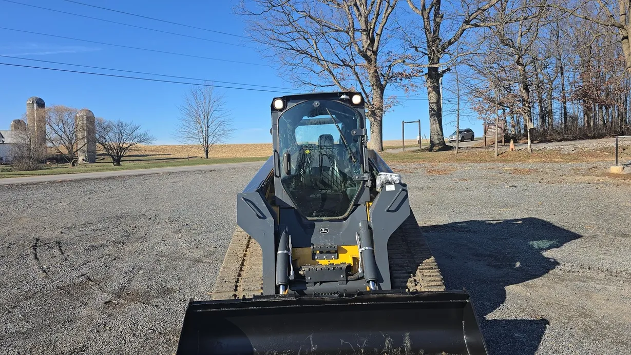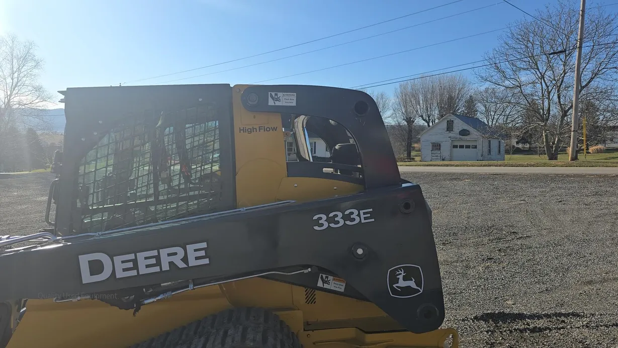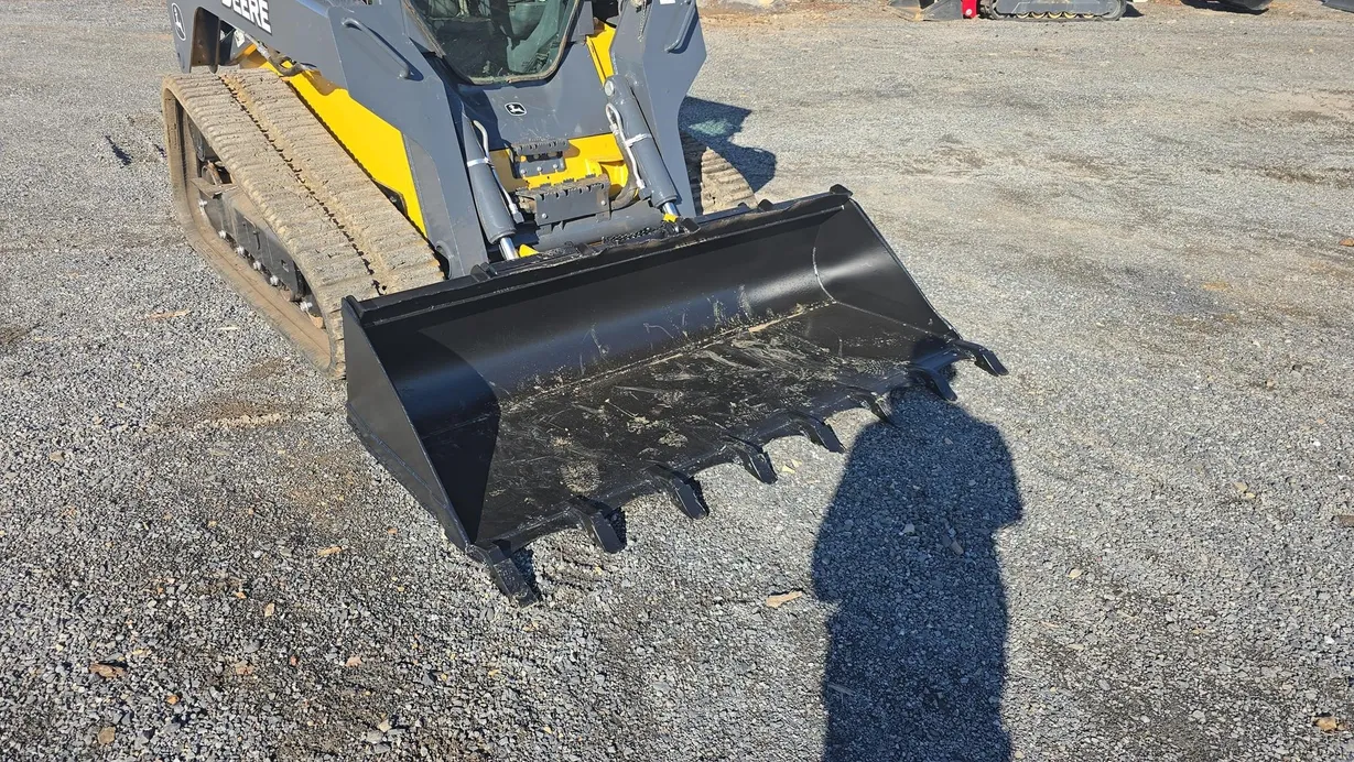 This 2015 Deere 333E compact track loader has 3,480 hours and is a well-maintained, job-ready machine ideal for construction, landscaping, and agricultural work. It features an enclosed ROPS cab with heat and air conditioning (HVAC system noted as not engaging), a comfortable cloth seat, and joystick controls for precise operation. The 333E comes equipped with high-flow auxiliary hydraulics and a manual coupler for added implement versatility. Power is supplied by a turbocharged Yanmar 4TNV94CHT diesel engine rated at 97 horsepower, providing strong performance for digging, grading, loading, and material handling tasks. This unit also features a vertical-lift boom design, two-speed travel capability (max 5.3 mph), and a breakout force of 6,600 lb, ensuring efficiency and productivity in demanding applications. Included with the machine is a general-purpose bucket, and the rubber tracks are in good condition with 70% remaining, while the undercarriage shows about 60% remaining life. The 333E has an operating capacity of 3,300 lb and tipping load of 9,425 lb, with an operating weight of 11,800 lb. Additional features include halogen lights, rearview camera, counterweight, and fully functional gauges. Overall, this 333E runs and operates very well, making it a reliable and versatile loader for multiple applications.
